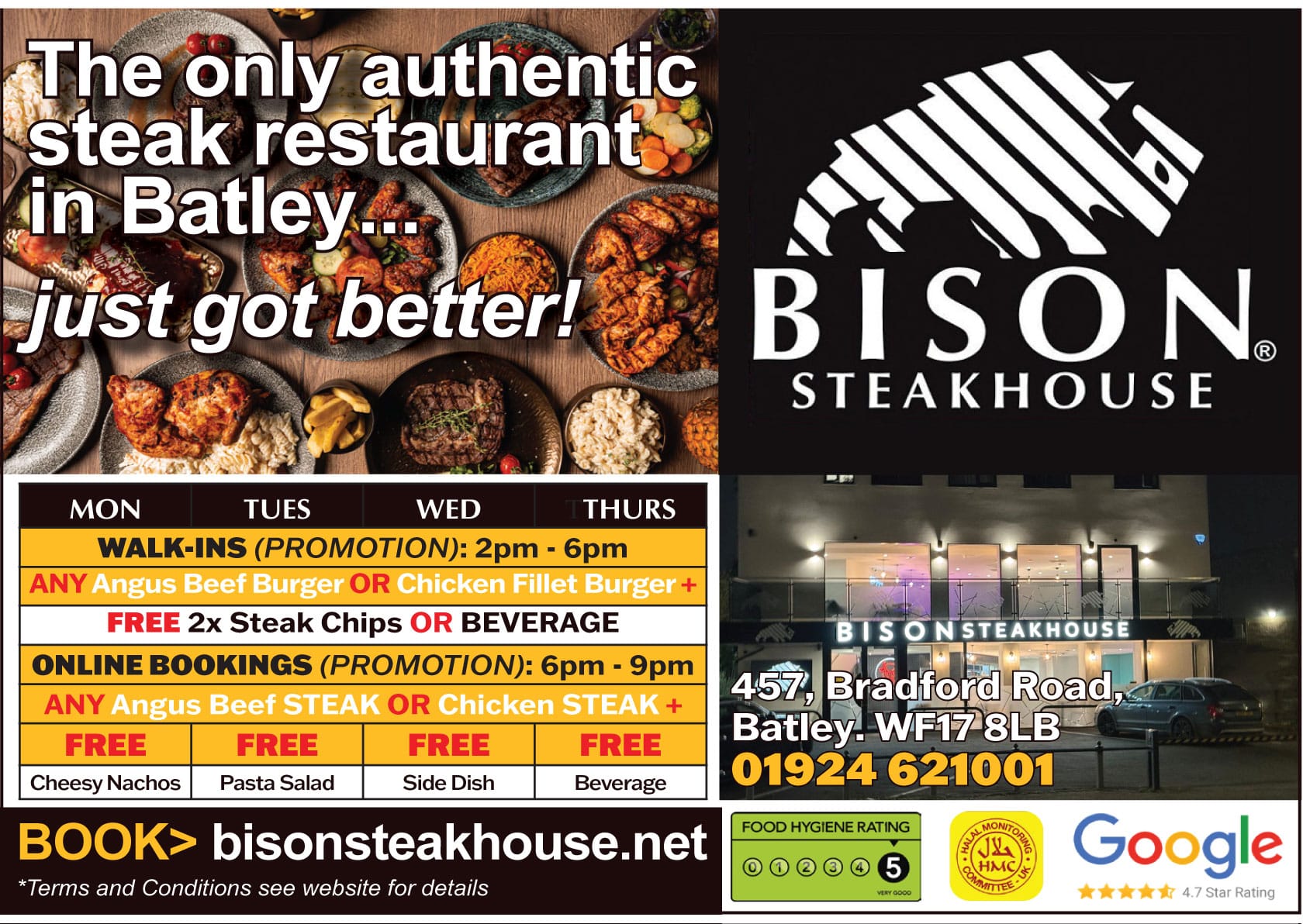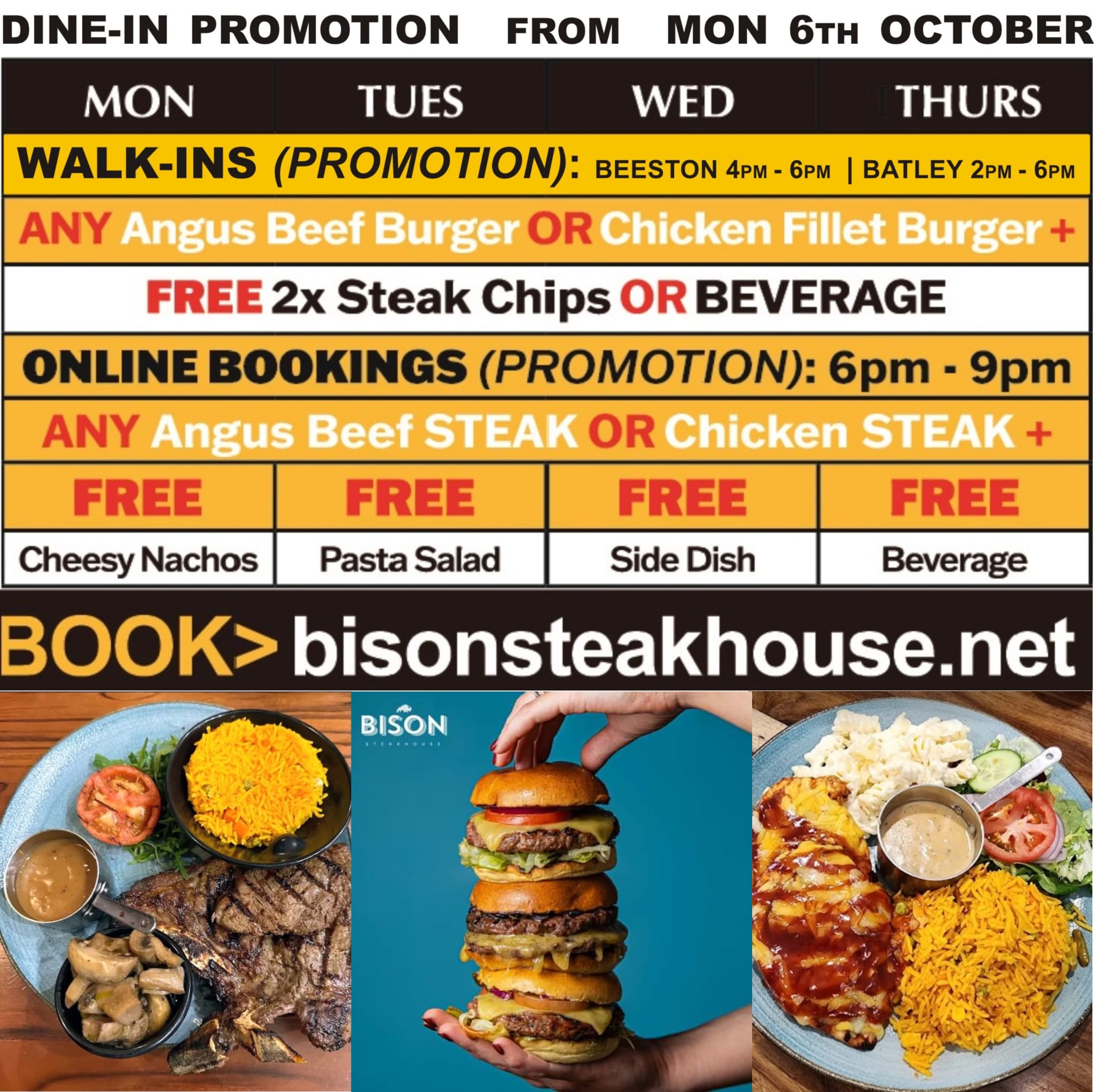 5) Limited time dine-in only promotion, and Bison Steakhouse has the right to withdraw the offers at anytime.