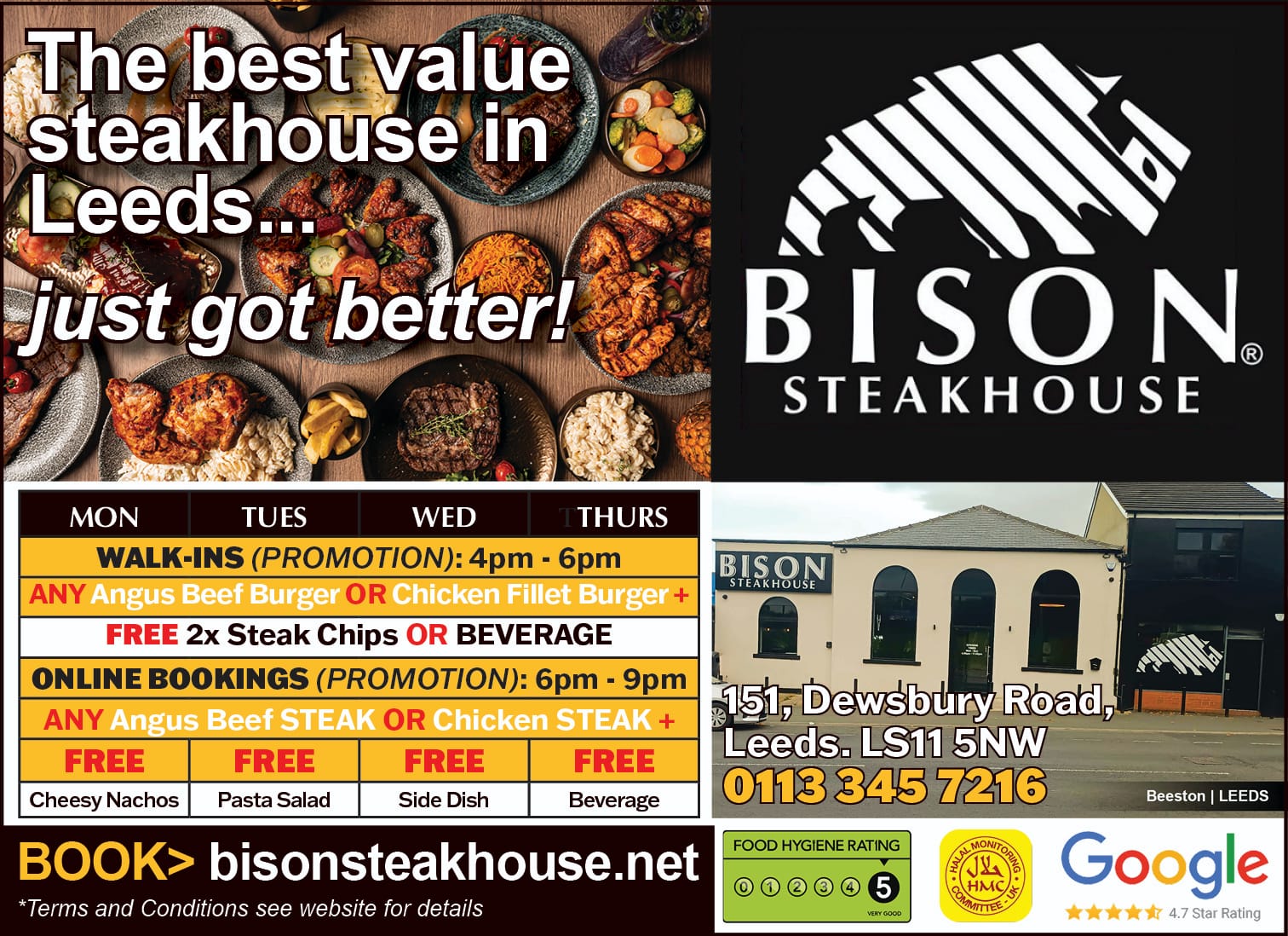 4) Table Bookings made online, are for maximum 8 people per booking, for promotional offers. Should your group/party be 8+, please call the Bison restaurant chosen, for alternative reservation.
